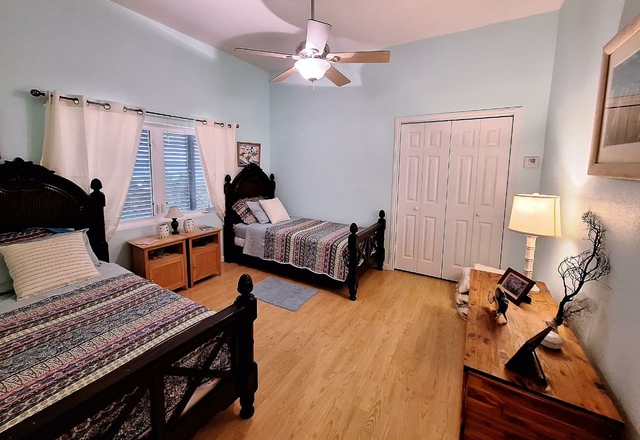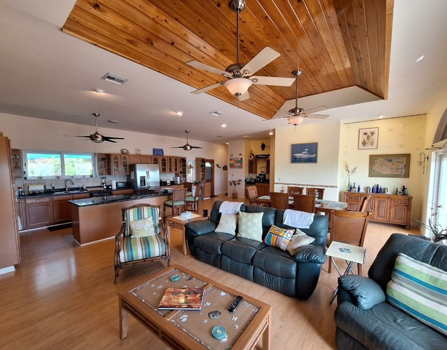 Located in Flamingo Bay which over looks Elizabeth harbor, Stocking Island, Crab Cay and is just minutes east of George Town’s amenities. Wonderful island style retreat with great versatility to become a rental income producing property. Main residence is 3 Bedrooms plus Study or 4th Bedroom, 2.5 baths with a 2-car garage. The cottage is a 1 bed, 1 bath with kitchenette and underneath is used for a storage/work area and or an emergency hurricane bunker. All connected by the front deck spanning the full length of the house giving 180-degree views from each room. The property has a fresh water well, rain water catchment and is partially fenced in. The back patio area is encased by a unique rock wall with a BBQ, fire pit, and herb garden. The property is beautifully landscaped with flowering plants and its paved driveway is lined by natural stone walls, palms and coconut trees. There are 2 deeded beach/water accesses across the main road where you can explore, snorkel, kayak or paddle board. Sweet Breeze’s views of the sun rise, rainbows and sun sets are truly stunning!
