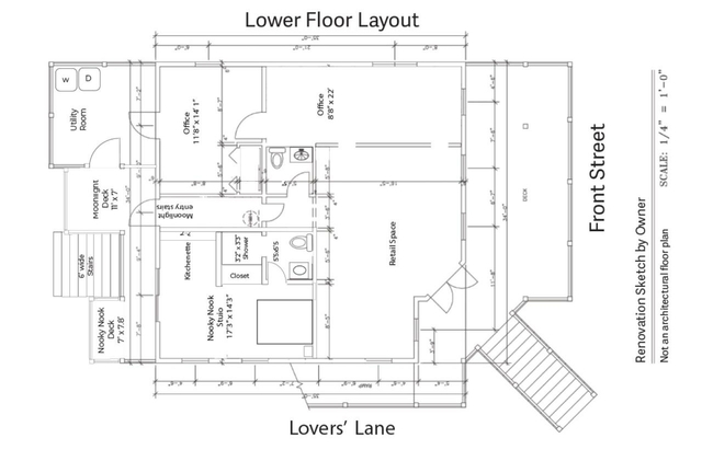 Situated on a double lot in the heart of Hope Town’s Historic Settlement, this commercial/residential building is a rare opportunity with three rental income opportunities. Moonlight penthouse is a two-bedroom, two-bath, second-story flat that commands $2,500+ a week in income. It offers views of both the harbor and the Atlantic Ocean. Downstairs, Nooky-Nook, an open floorplan studio commanding $1000/week, features a deck overlooking Lovers’ Lane (steps away from Vernon’s grocery, beach access, and the Lower Public Dock). The west-facing commercial space along Front Street is a prime location in the Hope Town Settlement and is currently leased as office/retail space. In addition, it has a restroom, a large entertaining deck, and a 120 sq. ft. ramp, useful for deliveries, strollers, and wheelchairs. A generous utility room services the rental units and functions as the owner’s storage area. A standby 20kw Perkins generator powers the entire building, and approximately 6000 gallons of water storage are split into three separate areas.