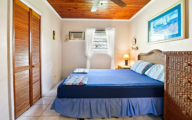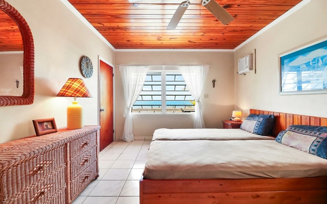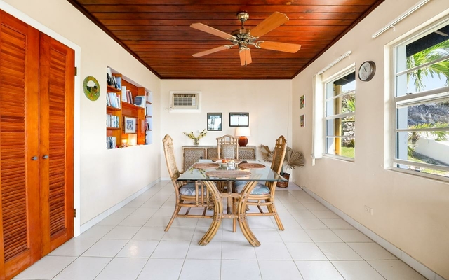 Directly facing the brilliant blue turquoise of the Caribbean or the south side of the island, and just a few steps from the calm waters, is the beautiful home known as The Seaside. A very well-constructed concrete structure of 2 bedrooms and 2 bathrooms with a Mediterranean flair, Seaside is a very light and airy home of 1700 sq ft with big sea views throughout the house and maintained carefully and with love. Next to the well-appointed kitchen- with a new dishwasher and refrigerator- is found a large pantry. Efficiency and comfort are reflected in the great room facing the ocean, which has a spacious area for watching TV, and a separate dining room, also facing the ocean. There is also extra space, which can be used for an office area or even another bedroom. Seaside also offers a generator, a garage with a car, plus a storage room full of tools and gardening implements! It is 100% turnkey and has been enjoyed as a home, not a rental. Although air-conditioned, the gentle sea breezes off the ocean [which keep power bills down] can be enjoyed outside either on a covered patio of