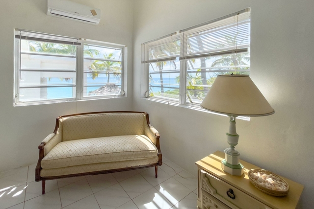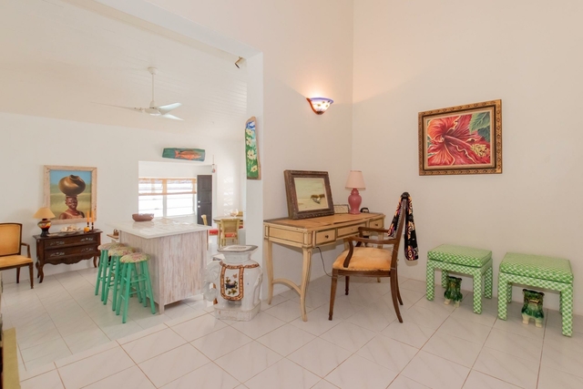 This well-maintained 2-bed, 2-bath retreat sits on a rare double lot with direct waterfront access and panoramic ocean views framed by mature coconut palms. The home offers island charm and modern comfort just steps from a smooth pebble beach with a sandy-bottomed sea ideal for swimming. Enter through the foyer to find stunning ocean views. Each bedroom features an ensuite bath; the primary suite includes a cozy seating area perfect for reading or late-night movies. A step-down great room with a native stone fireplace flows into an open kitchen and an additional entertaining area below—perfect for gatherings or quiet relaxation. Natural light and sea views flood the space. Outside, enjoy expansive patios, swaying palms, and turquoise waters—pure island living. A detached garage with laundry offers added convenience. The second lot allows for extra privacy or space to build a guest cottage.