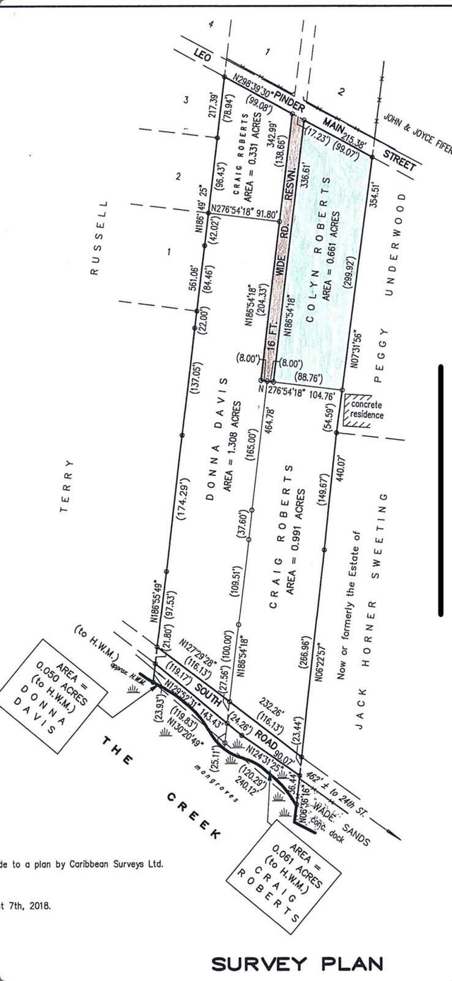 Single family lot offering 28,793 sq.ft of space and is a larger portion for Spanish Wells. It is approximately 90 ft wide and 300 ft deep and does have a 15 ft road reservation on the west side of the property. The ground is flat to the main road with a slight uphill rise to the south. Property has lots of native fruit trees like coconut and 2 very big Sapodilla trees. Centrally located close to restaurants, grocery stores and gift shops.