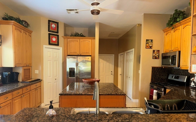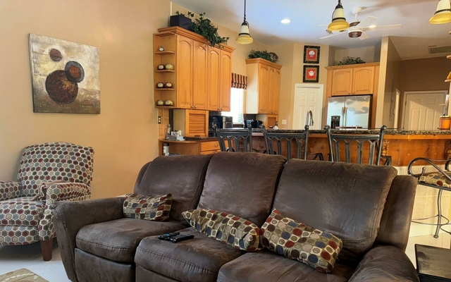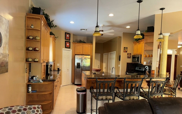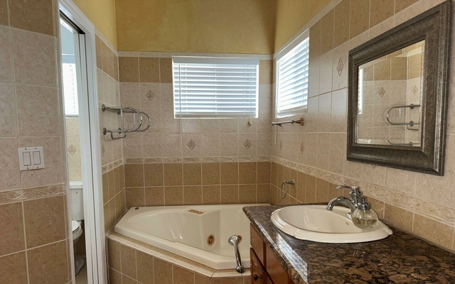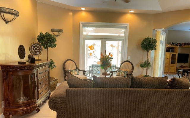 Attractive in design and practical in its floor plan, this two-car garage home features three bedrooms, 2.5 bathrooms, and warm, calming colors throughout. The ceilings are 10ft high, and the two guest rooms share a jack-and-jill bathroom. The airy living room with double French doors leads to the rear patio and swimming pool. This home has solid wood cabinetry in the kitchen and central air conditioning with ceiling fans throughout. The luxurious, oversized master suite is bright and airy, with large closets and a beautiful bathroom. The tropical landscaped yard is secured with a front gated wall and fencing on the other sides. This backyard is a great place to entertain with a covered patio and swimming pool. Arrange a viewing with us today.