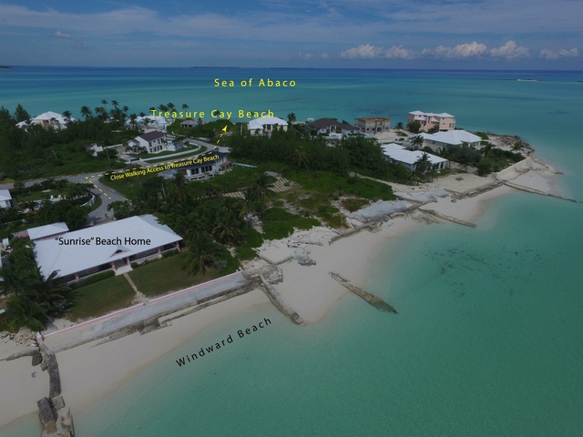 Sunrise Beach House, Windward Beach, located on a private cul-de-sac. Own this great open concept, totally refurnished turn key home which boast 2 of 3 ocean front bedrooms, 2 Bath with detached garage. Enjoy a drink when sunbathing on your own direct beach edge patio while witnessing every color of ocean blues. Sip your morning coffee under your covered patio while watching our stunning sunrises and boats at a distance heading out to our close fishing grounds. Bonus, this beach home is also located a short 5 minute walk to access the other 3.5 mile long Treasure Cay beach. Shopping & beachfront restaurants are only a 5 to 10 minute golf cart ride away. A must see, own your piece of Treasure Cay paradise and be a part of this close knit community today! The property is appointed with low maintenance landscaping, a backup generator and water system. Windward Beach at Sunrise Point, Treasure Cay, Abaco, Bahamas.