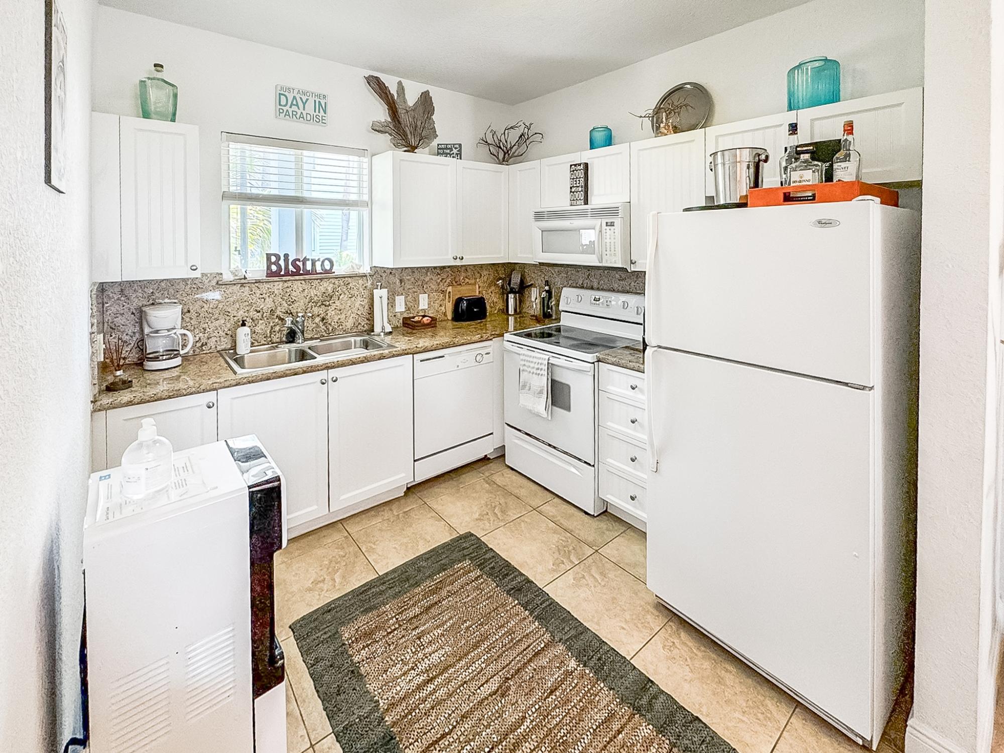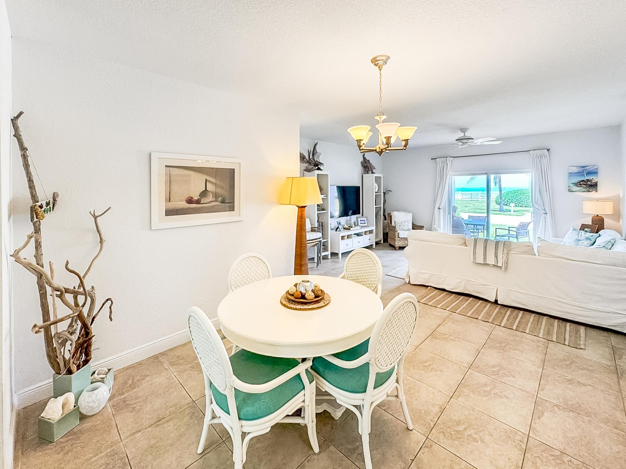 Welcome to Another Day in Paradise – a beautifully appointed oceanfront condo that captures the essence of island living. This stunning first floor La Concha model features 2 bedrooms, 2 bathrooms, and 1,365 sq. ft. of thoughtfully designed interior space, perfectly situated in the heart of the desirable Bimini Bay community. Step inside to an open, airy layout where expansive windows invite in abundant natural light and showcase breathtaking views of the turquoise sea. The spacious living room flows effortlessly to a private balcony—ideal for sipping your morning coffee, enjoying sunset cocktails, or simply soaking in the peaceful rhythm of the waves. The master suite offers a serene escape with a king-sized bed and a private ensuite bathroom, while the second bedroom includes 2 cozy twin beds—perfect for guests or family. A fully equipped kitchen features appliances and generous counter space, making it easy to prepare meals to enjoy indoors or alfresco on the patio with ocean views as your backdrop.