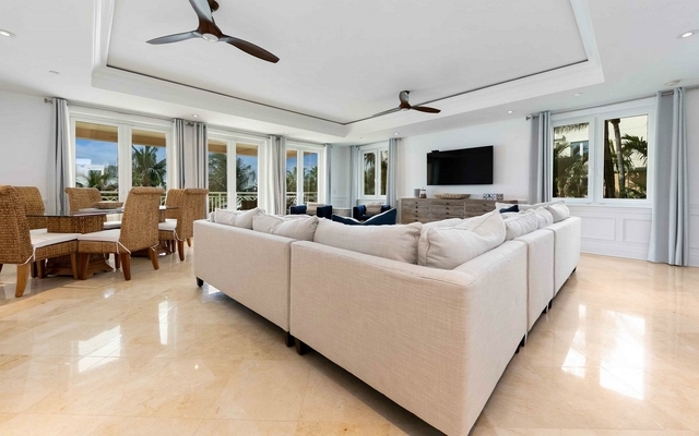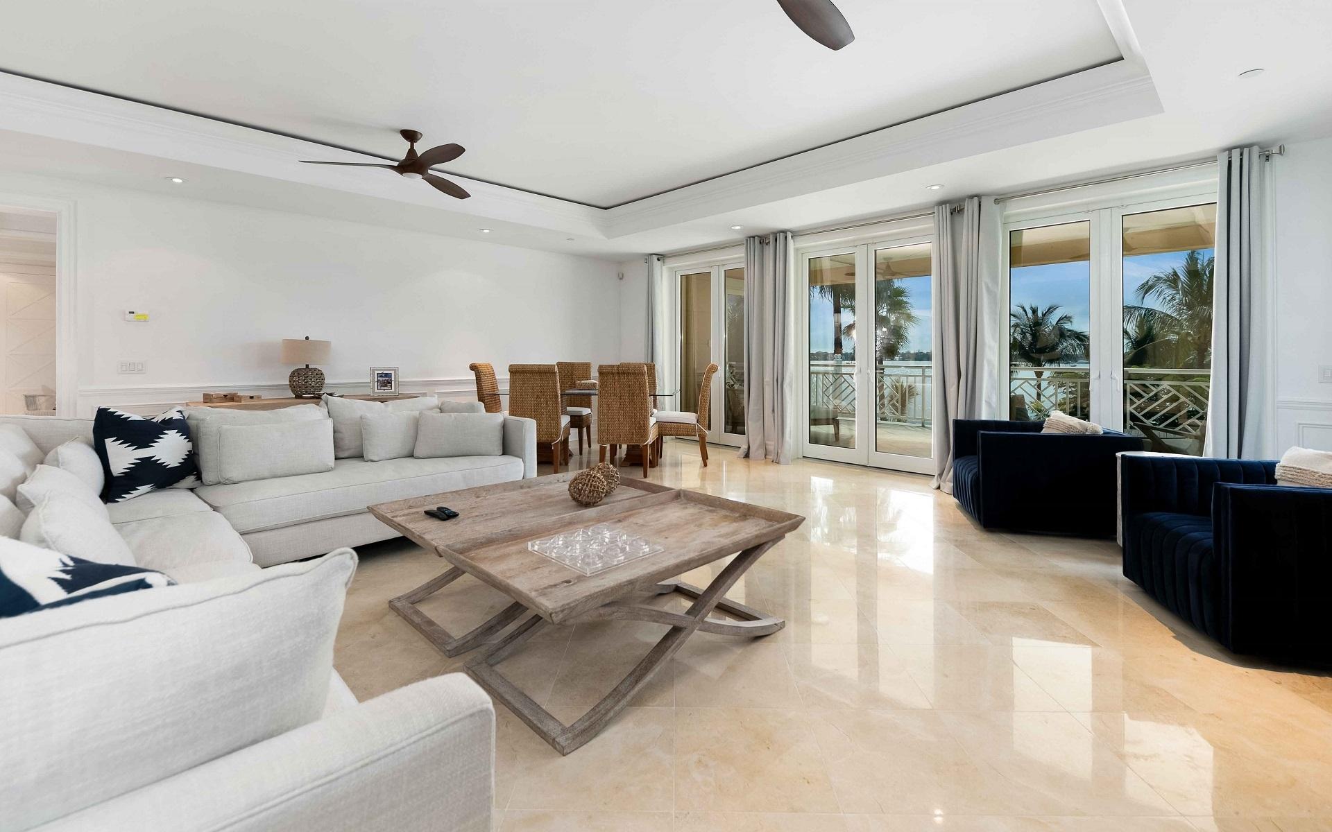 These newly listed 2nd-floor waterfront residences are professionally furnished in a transitional style and offer serene coastal views of Nassau Harbor. Thoughtfully designed with an open, airy interior that flows effortlessly onto three outdoor balconies, this residence is perfect for entertaining, relaxing, and enjoying the view. Features include beautiful limestone and porcelain flooring, a spacious kitchen with granite countertops and top of the line appliances, a stunning main suite with walk in closet, en suite bathroom with jetted tub, separate shower and a private balcony unique to this floor plan, two well appointed guest bedrooms with en suite bathrooms, high ceilings, impact windows and a reverse osmosis system. The Ocean Club Residences & Marina welcomes you with beautiful gardens accented by quiet pools, intimate arbors, and broad green lawns, a private beach club situated on the world-famous Cabbage Beach, a private marina, 24-hour security, a dedicated concierge on-site, a fitness center, underground and surface parking, as well as a whole backup generator.