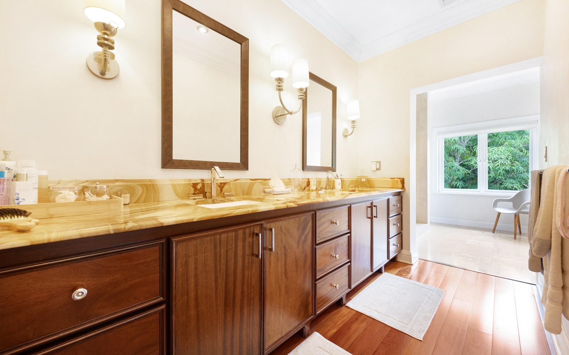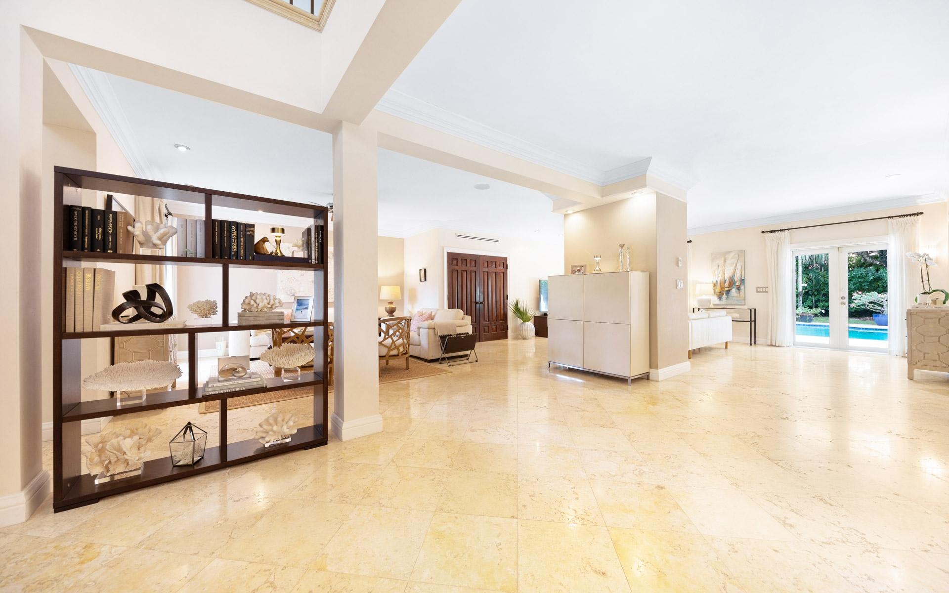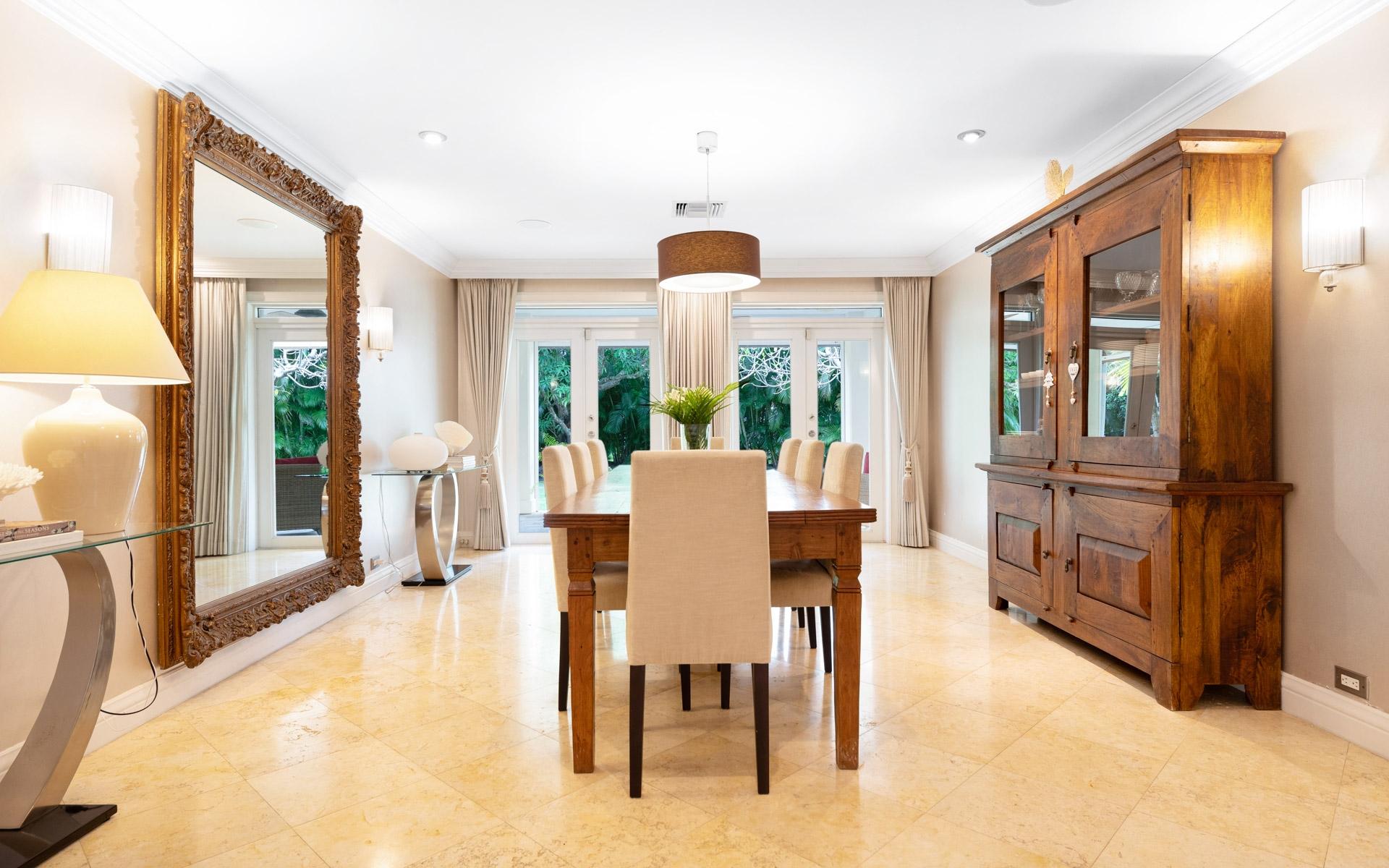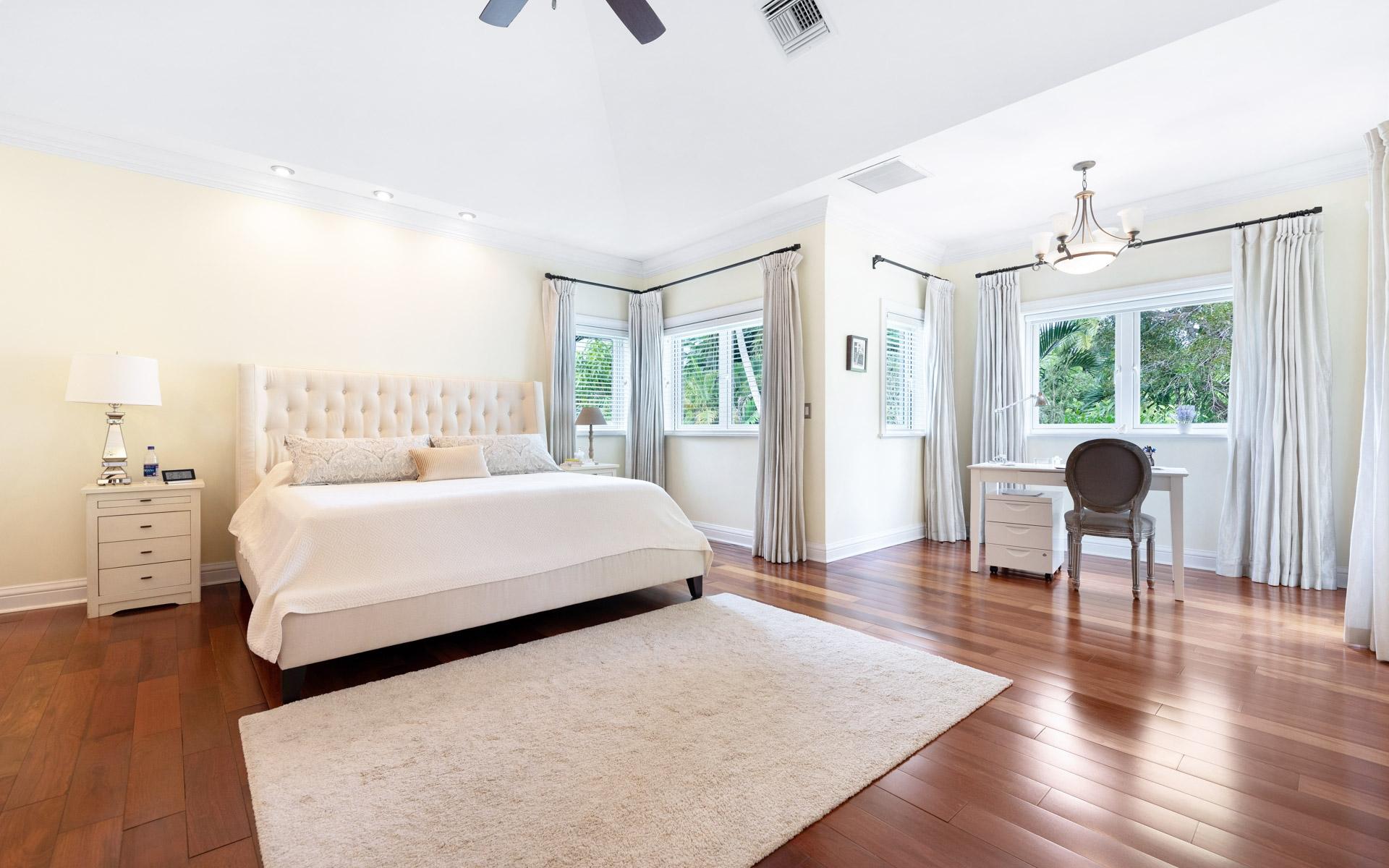 Set amid lush mature trees and vibrant foliage, Chelsea Place is a private sanctuary in the heart of exclusive Lyford Cay. Ideally situated just minutes from the Lyford Cay Club, this impressive two-storey residence combines timeless elegance with modern comfort—perfect as a family estate or refined island retreat. Initially built in the 1990s and fully renovated in 2012, the home underwent a transformative expansion that added a whole second floor with soaring tray ceilings and exquisite cherry wood floors. The property now features nine bedrooms in total—including five ensuite bedrooms upstairs, three bedrooms on the ground floor, and a self-contained guest cottage overlooking the pool. The lower façade is elegantly clad in Corallina stone, lending an air of sophistication. At the same time, the rear of the home evokes classic Caribbean colonial charm with sweeping verandas on both levels, draped in flowering vines that enhance its romantic, old-world appeal. Inside, a majestic entryway with a grand staircase and 20-foot ceilings creates a dramatic first impression.