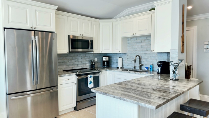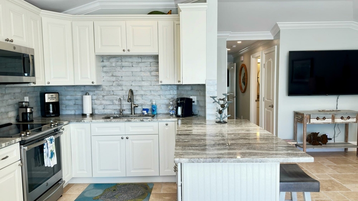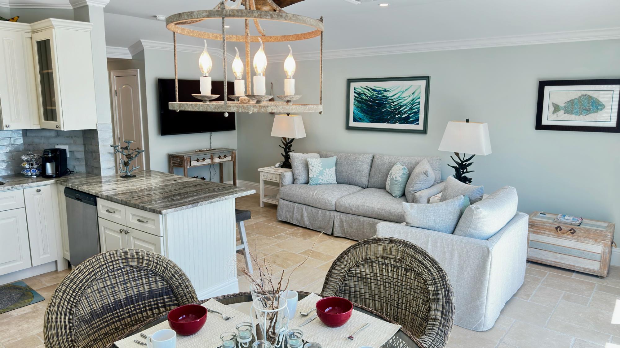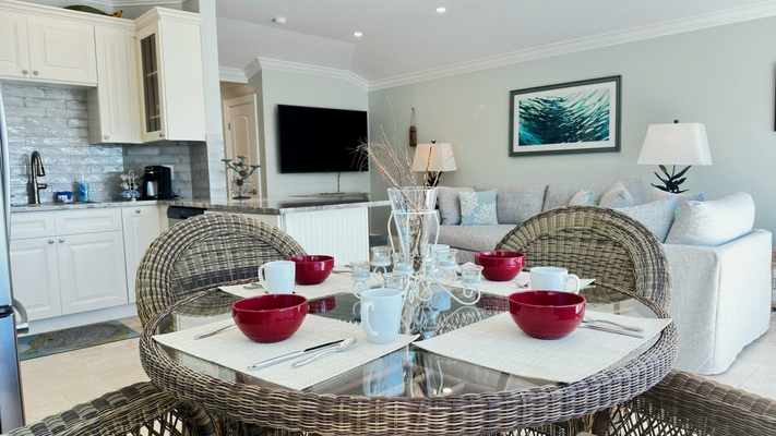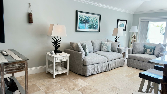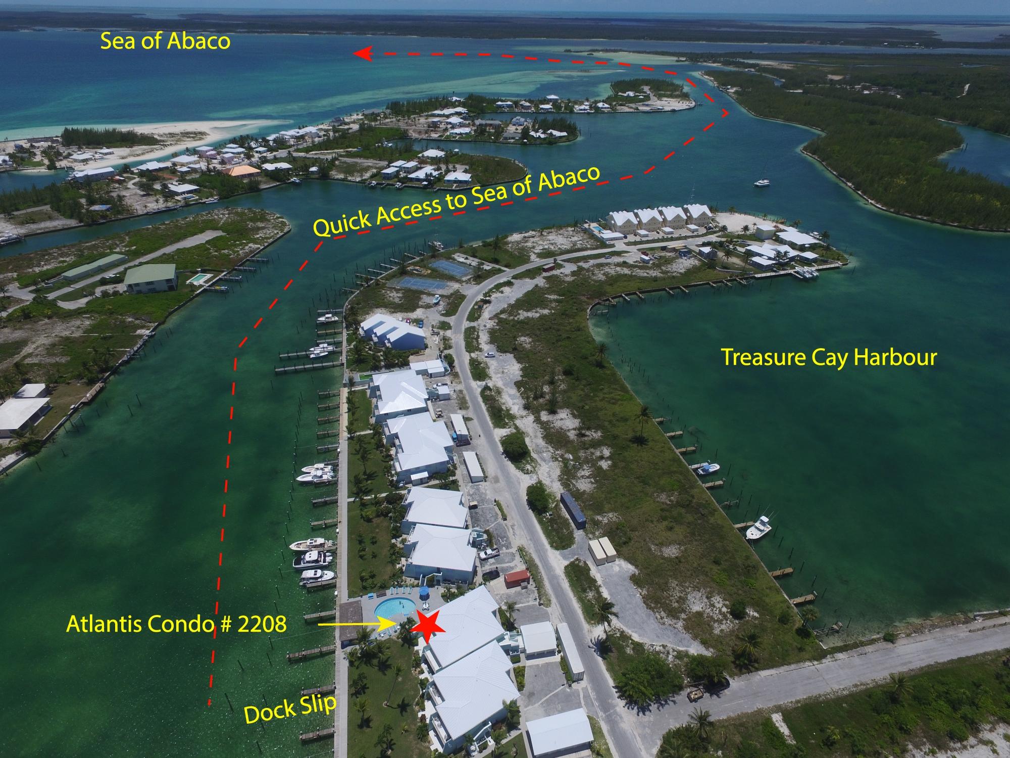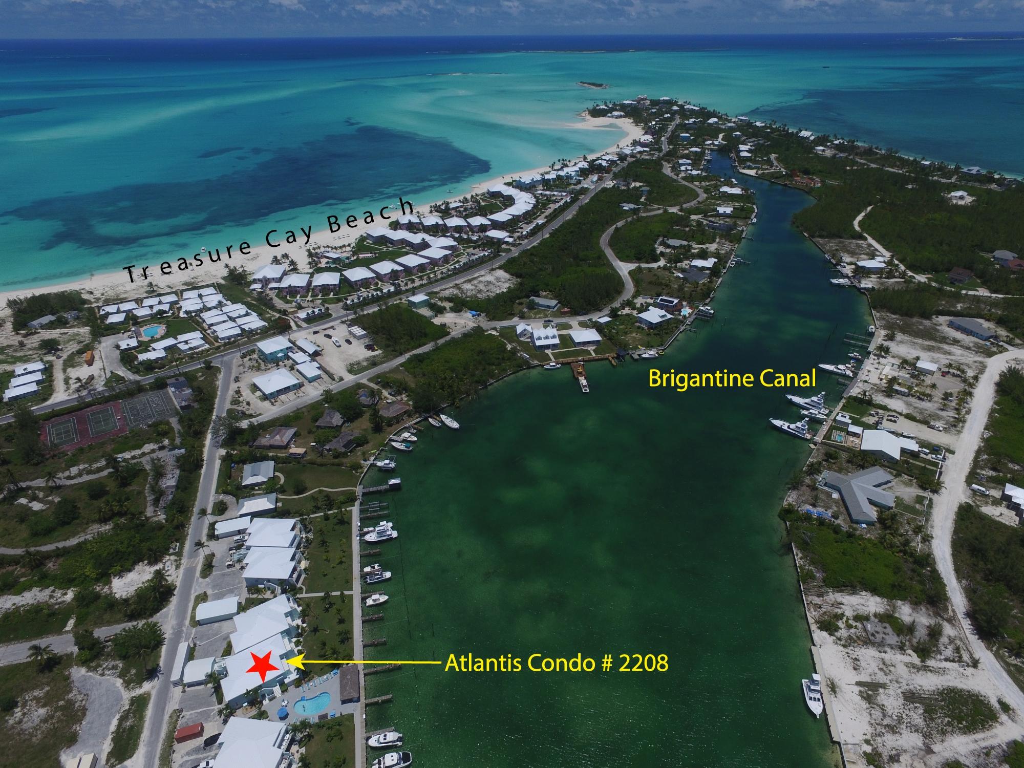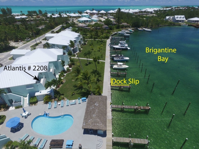 Atlantis # 2208 enjoy views and looking down on your assigned finger dock and boat slip capable of accommodating vessels up to 32 feet in length. This luxurious furnished unit is a beautiful second level 2 bedroom, 2 bath waterfront condominium, including storage garage overlooking tranquil Brigantine Bay within the prestigious residential resort community of Treasure Cay, Abaco, Bahamas. This tastefully finished waterfront condo offers a full 900 square feet of luxuriously casual living space The inviting and spacious open style living area configuration features two 8′ wide sliding glass patio doors extending across the entire width of the residence. The wide expanse of patio doors provides fantastic views over Brigantine Bay as well as opening onto a covered patio. Dine al-fresco under the stars and enjoy cooling ocean breezes from this elevated position. Atlantis has a community laundry located within the complex. All of this is in close walking proximity of Treasure Cay Beach, known for its powdery white sandy beaches and iridescent crystal-clear waters.