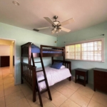 closets. The two other bedrooms share a bathroom. Bunk beds are in one bedroom, and a